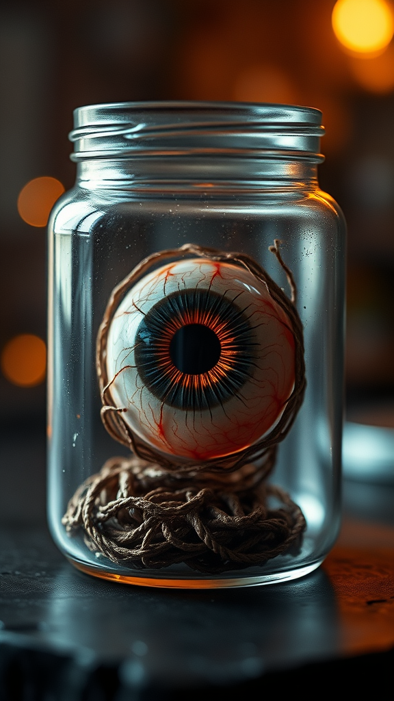 A human eye delicately preserved in a glass jar, designed with intricate details reminiscent of the artistry of Peter Mohrbacher and Greg Rutkowski, rendered in 8k ultra HD with striking photorealism, enhanced by the redshift effect. The image captures the mesmerizing complexity of the eye, its textures and colors meticulously crafted, set against a subtly glowing backdrop that accentuates the depth and mystery of the scene. The composition balances a sense of scientific curiosity with an ethereal, otherworldly charm, maintaining a harmonious blend of realism and artistic imagination.