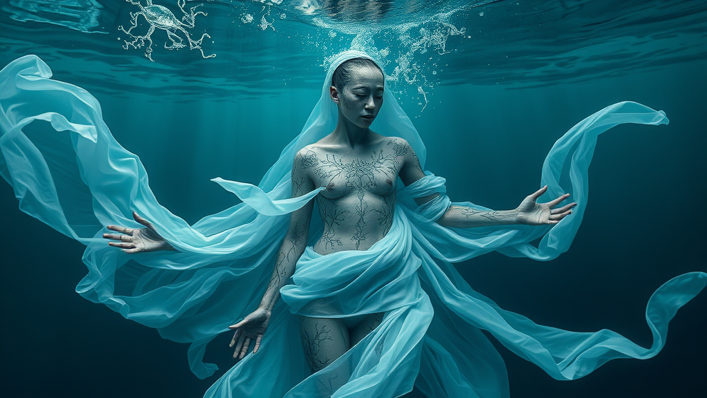 A human figure emerges, enveloped in an intricate underwater world, their form adorned with flowing fabrics that ripple like ocean currents. The interplay of dark turquoise and light white creates a mesmerizing contrast, reflecting the serene yet mysterious depths of the sea. Intricate body-painting dances across their skin, echoing the ultrafine details found in nature-inspired motifs such as coral branches and delicate sea creatures. The scene captures a sense of fluid grace and ethereal beauty, embodying the essence of a mystical ocean realm.