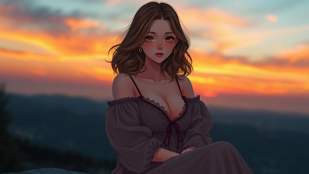 A human hyperrealistic depiction of an anime-inspired girl with wavy brown hair at medium length, showcasing an impressive and curvaceous figure. She's seated gracefully at sunset, around 8:30 pm, engulfed by a breathtakingly beautiful sky. The scene is captured in full body, with her detailed clothing meticulously designed, under cinematic lighting that enhances her stunning beauty. The intricate details are in sharp focus, with an f/1.8 aperture and 85mm lens employed to capture the essence of the moment. The atmosphere is enriched by volumetric fog, and the image's high dynamic range is captured in brilliant 4K and 8K resolutions. Subtle blush accents her cheeks, enveloped in a gentle blur to add depth. The artistic mastery ensures that the composition avoids any deformities or misplaced elements often seen with beginner endeavors, delivering a polished and captivating masterpiece.