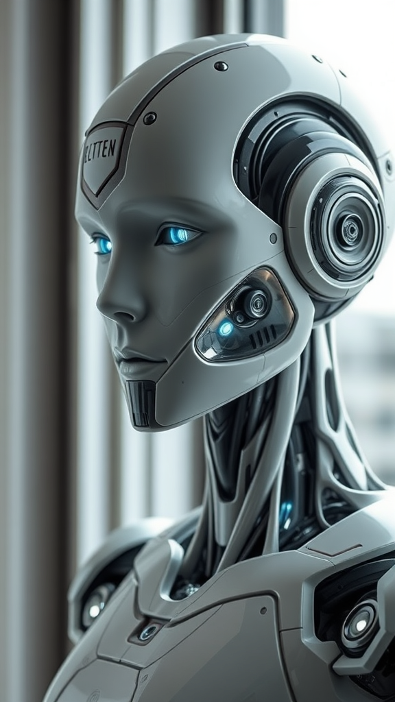 A human-like android standing by the window, focusing on a detailed close-up of its face, showcasing advanced artificial intelligence with features resembling a human. This futuristic robot portrait captures the essence of a humanoid with strong AI, hinting at the approaching AI singularity. The intricately designed android face reflects the merging of technology and humanity, presenting a compelling fusion of human features and robotic elements.