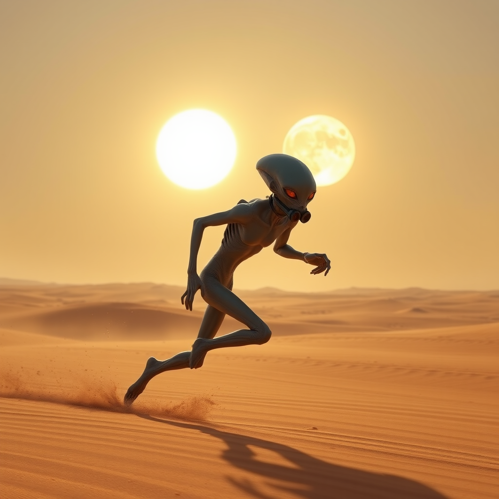 A humanoid alien, donning a sleek breathing apparatus, races across the sun-scorched desert landscape, sand swirling around its nimble feet as the alien's reflective eyes scan the horizon under the relentless glare of the twin suns.