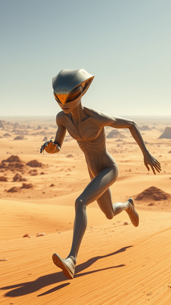 A humanoid alien, sprinting across a vast desert landscape, wearing a sleek, reflective mask that shimmers under the blazing sun.