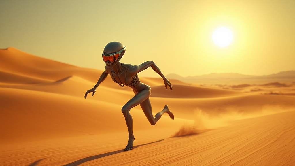 A humanoid alien, sprinting across an arid desert landscape under a blazing sun, wearing a sleek, reflective mask that shimmers with the colors of the shifting sand dunes.