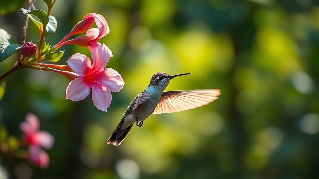 A hummingbird hovering delicately next to a vibrant blossom, captured in a stunning masterpiece of motion, side profile, surrounded by a lush forest backdrop, illuminated by gentle natural light, high resolution, ultra-realistic depiction, capturing the essence of wildlife photography with intricate details and extreme precision, 32k resolution, enhanced clarity, aspect ratio 5:7.