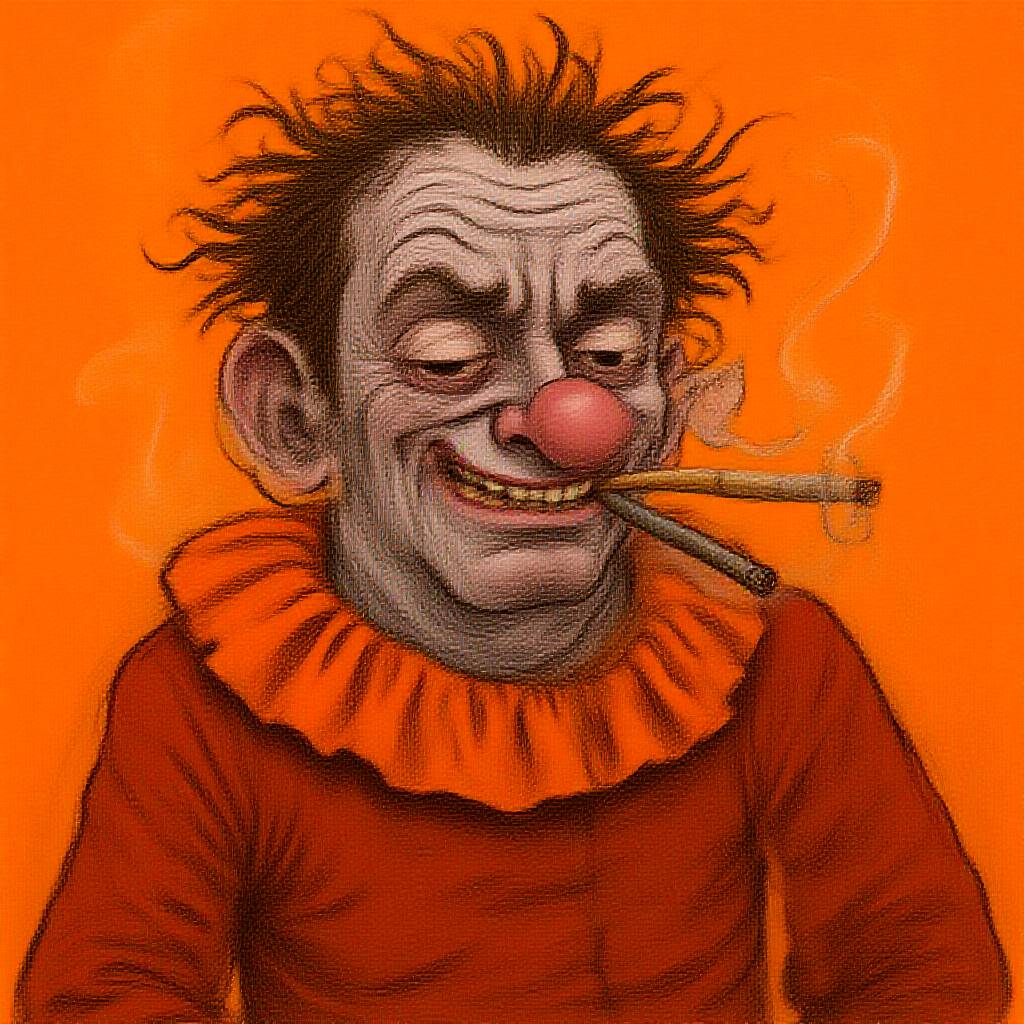 A humorous caricature depicting a disheveled clown character, male, aged 45, with a chaotic and grumpy demeanor. His elongated face features an exaggerated, bulbous nose, sunken eyes, and a prominent chin, all accentuating his tired, disgruntled expression. The lanky body is clad in a shabby red shirt and a wrinkled, oversized orange collar. Droopy eyes peer out beneath a mess of unruly hair, while a lit cigarette dangles casually from his mouth, adding to his slouched, exhausted pose. The vibrant orange background swirls with wisps of smoke, completing the comedic yet melancholic portrait.