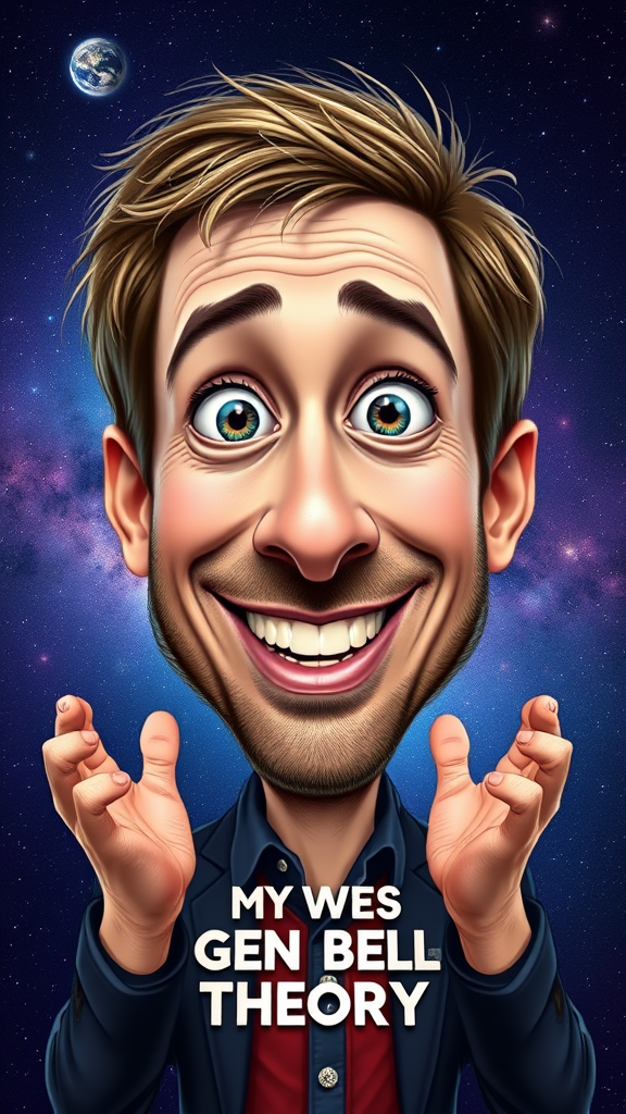 A humorous caricature of Simon Helberg, known as Howard from The Big Bang Theory, depicted with wide eyes and a broad smile, inspired by the artistic styles of Sebastian Krüger and David Cowles. The illustration features detailed and intricate skin texture, set against a vivid starscape background. The image includes centered text and expressive hands, with elements extending out of frame to create a 3D effect. Despite being low resolution, the artwork maintains its charm with quirky deformities and exaggerated features, avoiding multiple people or faces to focus on Simon's unique character.