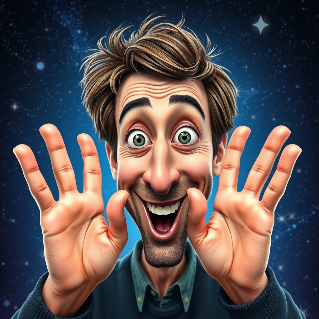 A humorous caricature of Simon Helberg, known for his role as Howard in The Big Bang Theory, depicted with an expressive wide-eyed smile in the iconic art styles of Sebastian Krüger and David Cowles. Featuring detailed and intricate skin textures, the scene is set against a vivid starscape background with striking, centered text. The hands are prominently displayed, revealing a playful 3D quality that extends beyond the frame. Rendered in high resolution, the composition maintains a focus on artistic charm and individuality.