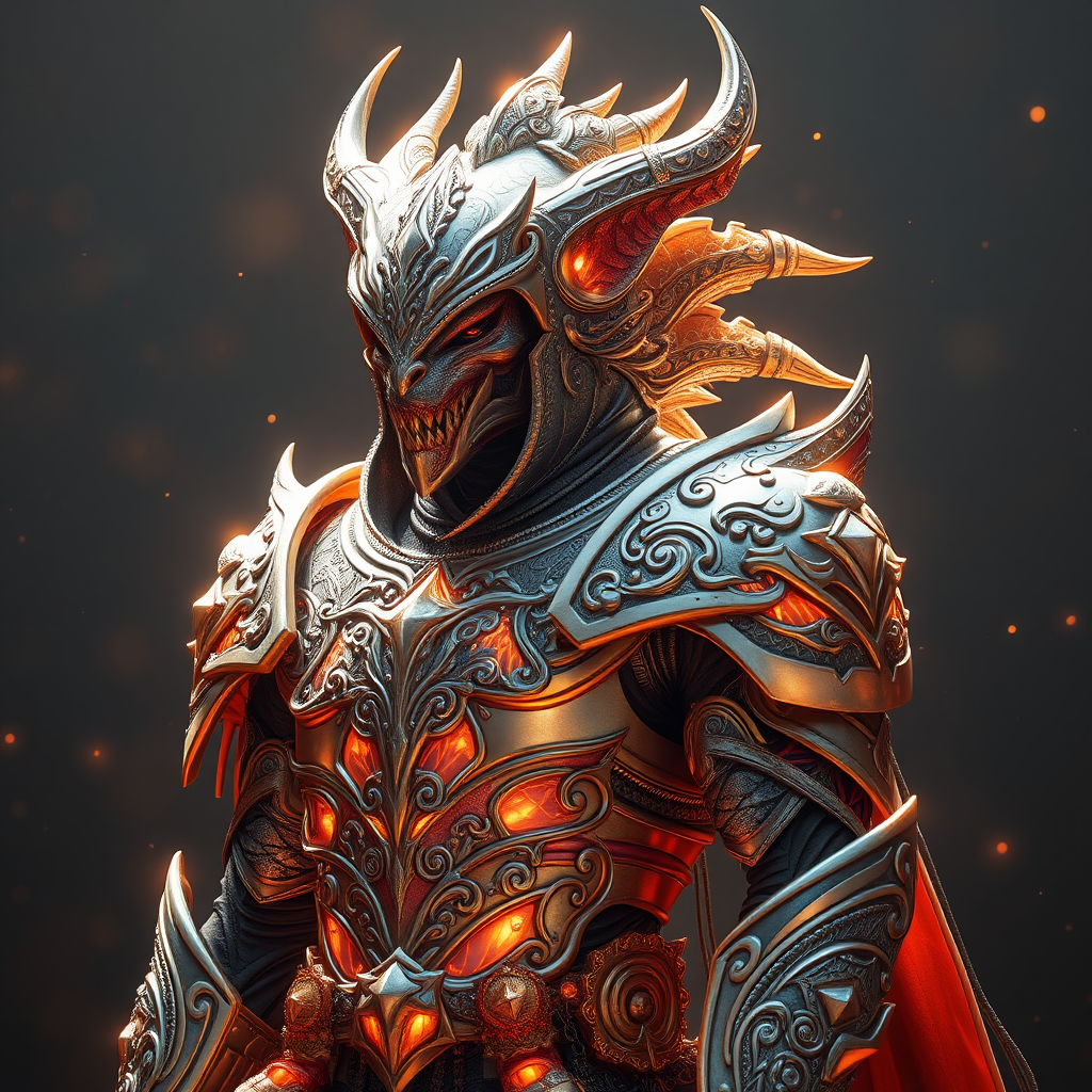 A hybrid creature, part beast and part human, donned in elaborate, radiant armor crafted from ethereal silver metal, its surface intricately adorned with ornate designs reflecting an otherworldly elegance, set against a fantasy backdrop. The armor shimmers with earthy tones, exuding an aura of mystic power, its sleek and fancy design highlighting the assassin's formidable nature. This stunning figure is surrounded by a celestial glow, where intricate details come alive under a supernova-like brilliance captured in vivid, 8k resolution. Volumetric lighting cascades over the scene, revealing both the menacing and majestic essence of this enigmatic being, adding a surreal, ethereal quality that blends seamlessly with their surroundings under a wide aspect ratio.