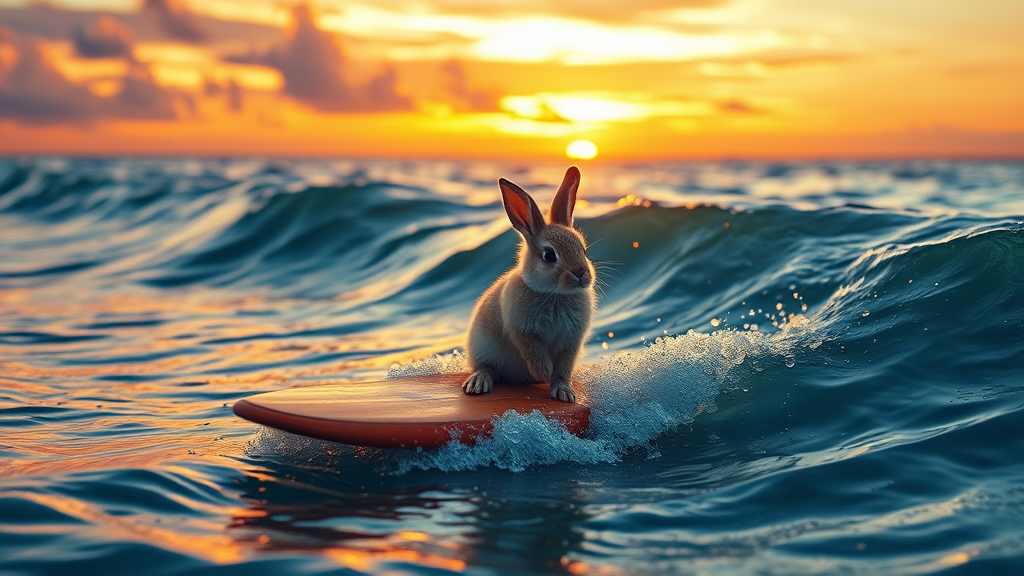 A hyper-detailed 32k image of a fluffy baby bunny riding a surfboard on a shimmering ocean wave, with dramatic cinematic lighting casting golden hues across the scene during a breathtaking sunset, where the vibrant sky is painted with shades of orange, pink, and purple, and the water glistens with reflections of rippling sunlight.