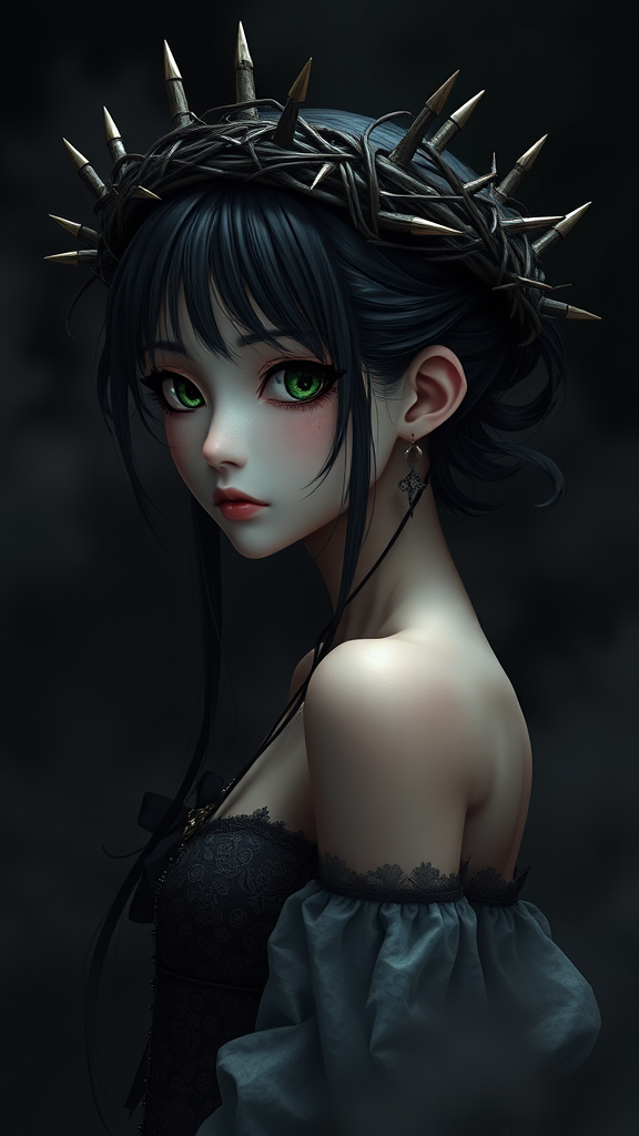 A hyper-detailed 3D model of a graceful, slender girl adorned with a crown of thorns and additional spikes, blending the refined style of realistic portraiture and anime-inspired aesthetics. Her enigmatic expression exudes elements of heistcore and dragoncore, embodying a fusion of delicate realism and mythical intensity. The scene is enveloped in dark, muted colors, enhancing the intricate textures and lifelike appearance of her realistic figure. She stands amidst an aura of mystery and elegance, where every detail amplifies the anime-inspired yet realistic essence of her character.