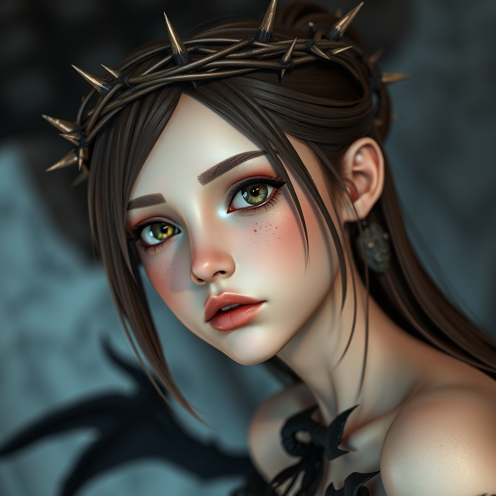 A hyper-detailed 3D model of a slender, beautiful girl wearing a crown of thorns, adorned with additional spikes, blending the styles of realistic portraiture and anime-inspired characters. Capturing a heistcore and dragoncore aesthetic, the scene showcases her in a natural pose with delicate realism, surrounded by dark, moody colors, evoking an enigmatic and dramatic essence while maintaining a lifelike and intricately detailed appearance.