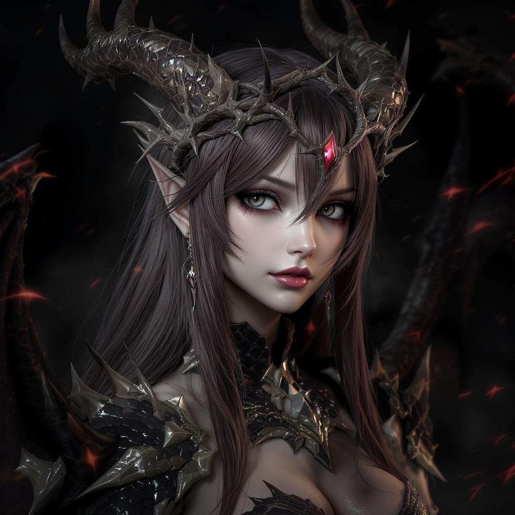 A hyper-detailed 3D model of a slender girl with striking anime-inspired features, wearing an intricate crown of thorns adorned with additional spikes. Her expression is one of enigmatic determination, inspired by heistcore and dragoncore themes. Her attire is a captivating blend of realism and fantasy, featuring scales and motifs reminiscent of a dragon's armor. The portrait captures delicate realism with dark, rich colors that evoke mystery and allure, set against a dramatic, shadowy background.