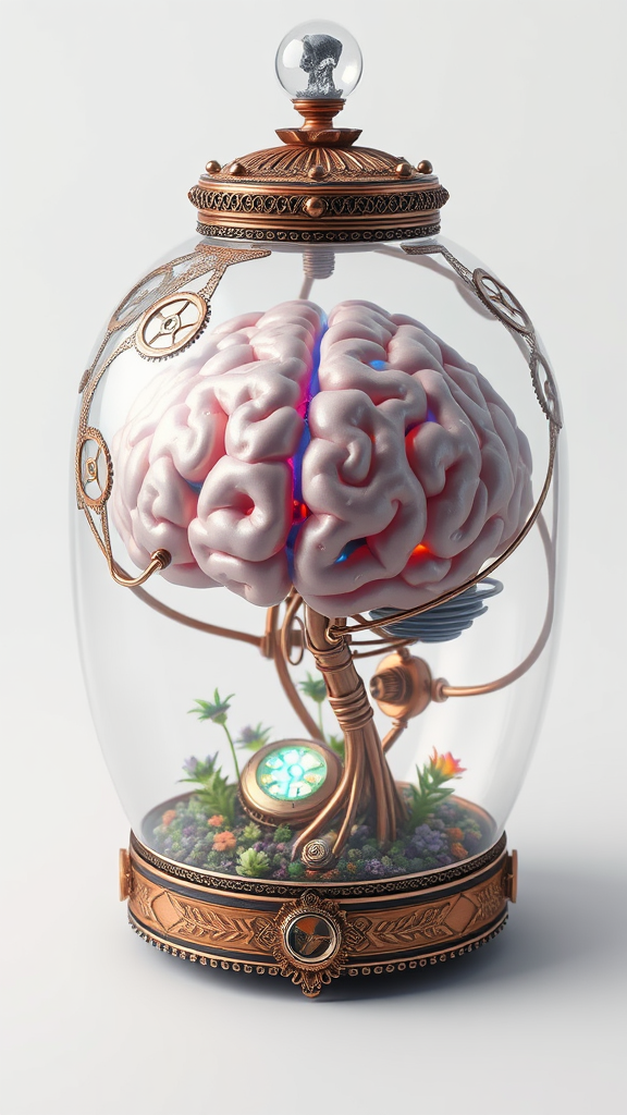 A hyper-detailed 3D render of a sci-fi baroque concept design featuring an anatomically correct brain device encased in a transparent terrarium dome. The device is adorned with intricate steampunk elements, including exposed gears and copper tubing intricately woven throughout. Delicate filigree detailing embellishes the structure, enhancing its ornate aesthetic. Inside the terrarium, the brain pulsates gently, surrounded by a miniature ecosystem of bioluminescent plants and tiny clockwork creatures. The entire composition has a photorealistic finish, showcasing a blend of scientific precision and artistic flair, with subtle modifications that blend historical baroque elegance with futuristic innovation.