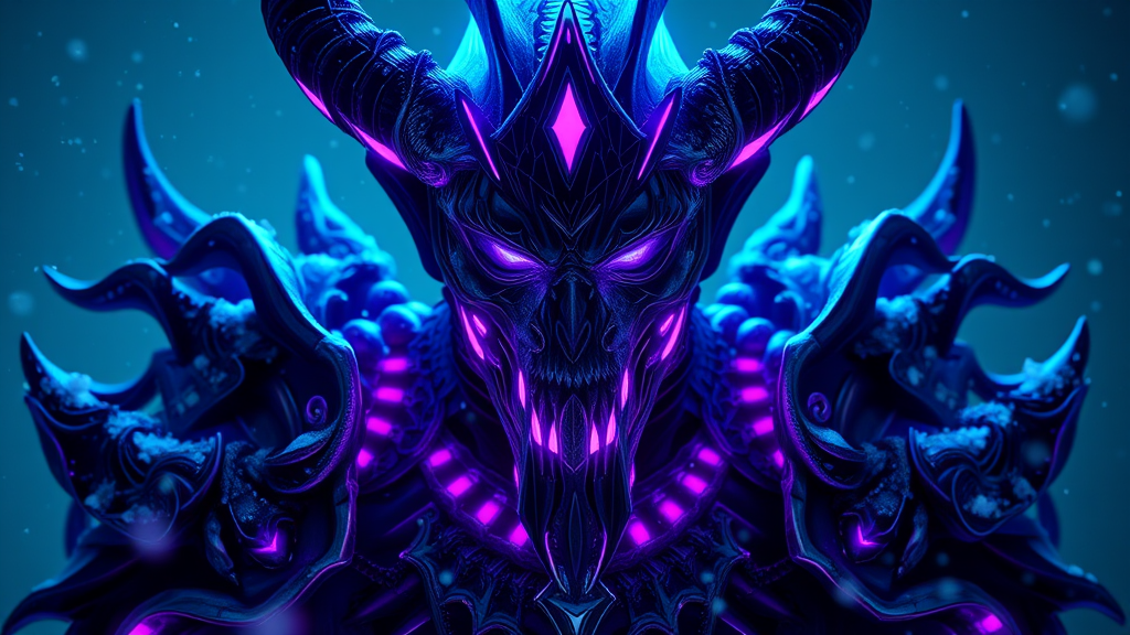 A hyper-detailed 8k ultra-realistic depiction of a fearsome demon reminiscent of the Night King from Game of Thrones, envisioned by George R. R. Martin. This full-body portrait showcases the demon in intricately ornate purple and blue neon armor that glows with an otherworldly light. The scene is bathed in cinematic lighting, enhancing the demon's menacing presence. The image is trending on ArtStation and rendered in 4k with Unreal Engine 5, capturing every fine detail with an uncanny focus. Subtle snowfall surrounds the demon, highlighting the chilling aura, while shadows dance across its visage, adding depth and intensity. The atmosphere conveys a spine-chilling yet captivating allure, set in a 9:16 aspect ratio, ensuring a dramatic visual experience.
