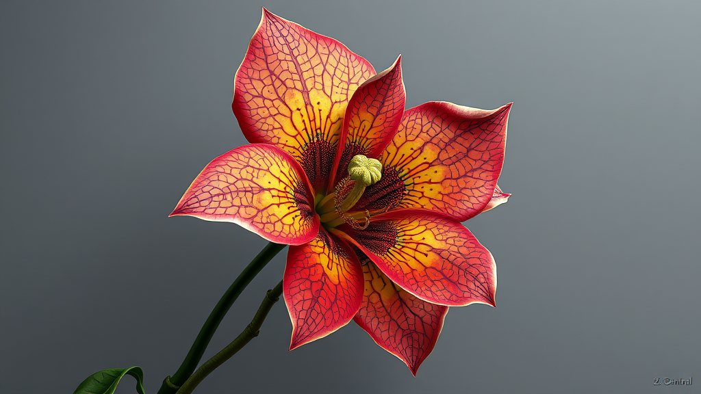 A hyper-detailed airbrush painting of an exotic flower with intricate patterns, inspired by Ernst Haeckel, against a muted gray background, featuring vivid color contrasts and bold outlines reminiscent of cloisonnism, with biomorphic forms, trending on ZBrush Central.