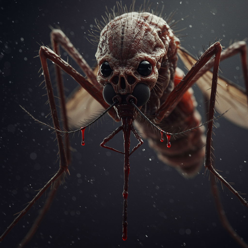 A hyper-detailed and lifelike portrayal of a menacing mosquito, illuminated by natural light, revealing its intricate skin textures. Its ghastly form looms in a sinister setting, exuding an aura of horror. Blood drips ominously from its needle-like fangs, while its soulless black eyes hold an unsettling gaze. The creature's body bears the marks of an ancient struggle, with scars etched across its surface. Set against a shadowy backdrop, the close-up view accentuates its monstrous features, evoking a chilling sense of dread.