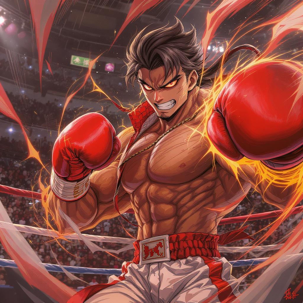 A hyper-detailed anime-style painting depicting a powerful man with a chiseled chin and intense focus, standing in a boxing ring. The scene captures the moment of an impactful punch, with dynamic motion and energy radiating from the athlete, reminiscent of Will Smith’s confident demeanor. The artwork is trending on Artstation, influenced by the dynamic styles of Jazza, Rossdraws, and Kawacy, while incorporating the intricate detailing of Sachin Teng's and the vivid, vibrant colors suitable for a card game illustration and a striking profile picture.