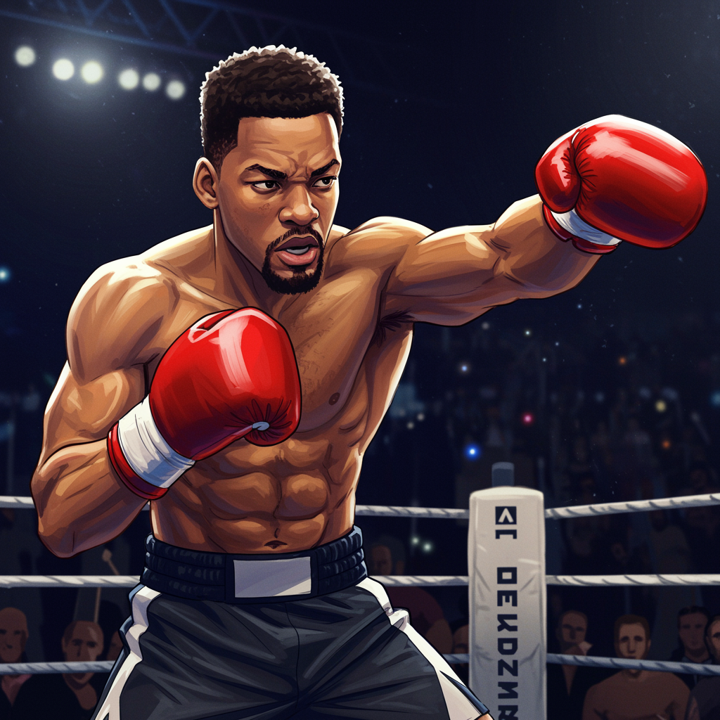 A hyper-detailed anime-style painting depicting a man in the center of a boxing ring, showcasing a powerful stance with a striking chin, throwing a dynamic punch. The artwork channels the artistic flair of Jazza and RossDraws, popular on Artstation, with influences from Kawacy and Sachin Teng. This illustration echoes the bold aesthetics of card game art, blending action and intensity while capturing an animated likeness of Will Smith. Ideal for a striking profile picture, the piece exudes energy and artistry.