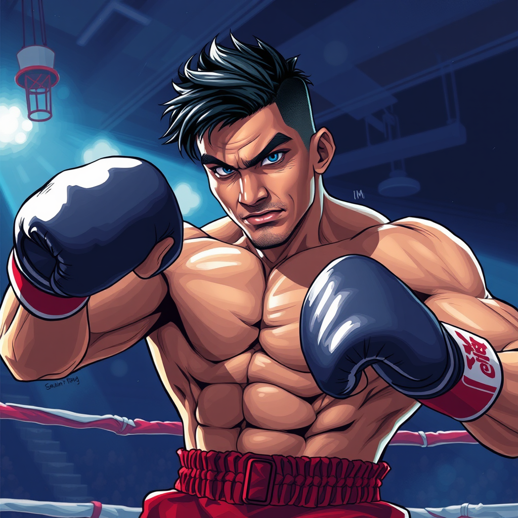 A hyper-detailed anime-style painting of a man in a boxing ring, inspired by the styles of Jazza, RossDraws, and Kawacy, perfect for a card game illustration. The scene captures the man mid-punch, showcasing his powerful chin and determined expression. His stance is dynamic and full of energy, making for an eye-catching profile picture. The vibrant colors and meticulous details reflect the trending art styles on Artstation, with a touch of Sachin Teng's unique flair. Imagine a character akin to Will Smith, reimagined in an anime universe, exuding charisma and strength in every brushstroke.
