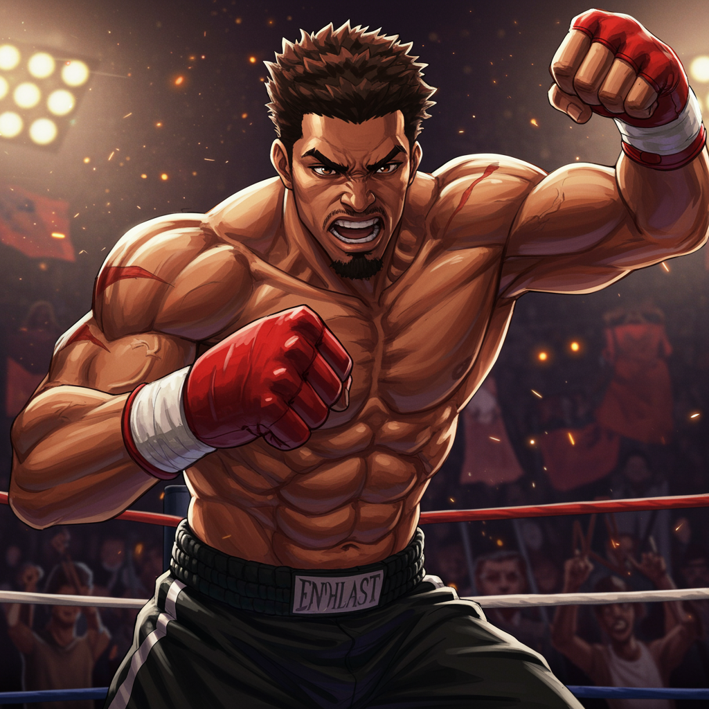 A hyper-detailed anime-style painting of a powerful man in a boxing ring, with a focus on his strong chin as he delivers a dynamic punch. The artwork captures the dynamism and energy of a card game illustration, inspired by the styles of Jazza, RossDraws, and Kawacy, with hints of Sachin Teng’s unique flair. The scene is centered and crafted to be a standout piece, trending on Artstation, perfect for a striking profile picture. The character features elements reminiscent of a stylized Will Smith in an anime rendition, emphasizing bold expressions and intense motion.