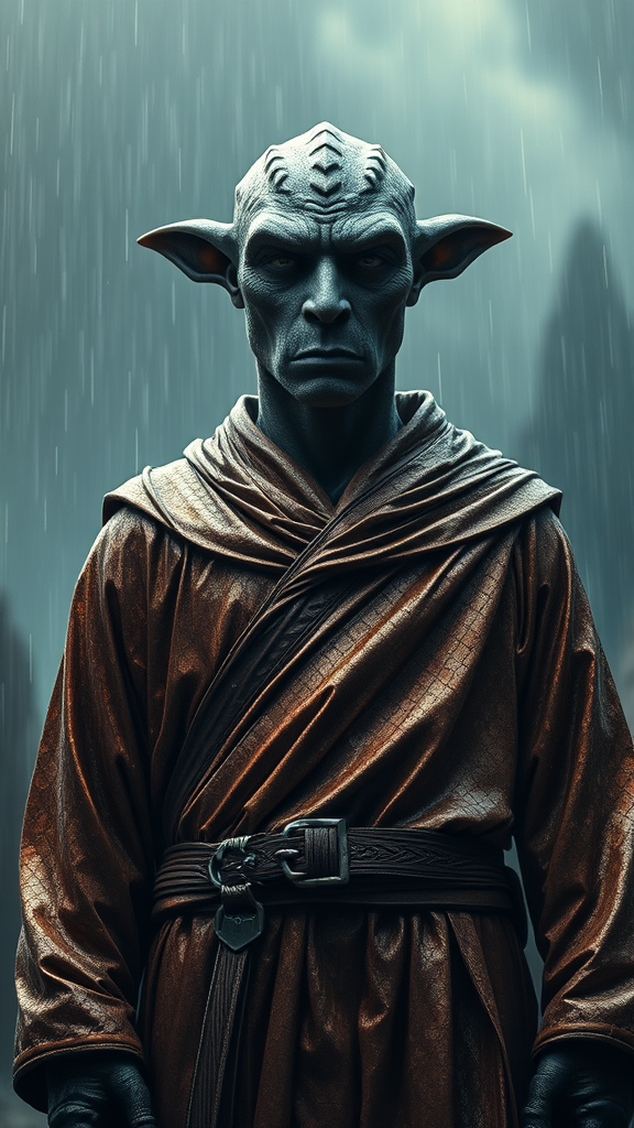 A hyper-detailed anthropomorphic Targarian dressed in shimmering robes stands in the rain, their features captured with hyper-realism. The scene is a stunning composition, evoking intense emotion with its epic cinematic lighting. The image is rendered in 8k resolution, as if shot on a Hasselblad H6D-400c Multi-shot, emphasizing the fine textures and intricate details. The figure's expression hints at a deep story, set against a backdrop of swirling rain and dramatic skies, offering an element of unexpected chaos and mystery to the otherwise regal and composed Targarian presence.