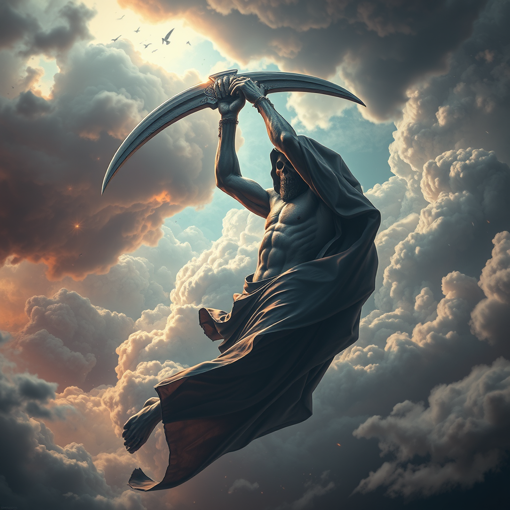 A hyper detailed, cinematic, and colorful depiction of the Reaper descending gracefully from the heavens amidst swirling, stormy clouds. The scene captures a cosmic sky war, illuminated by soft rim lighting and enhanced with volumetric lighting effects. The Reaper's form is anatomical and elegant, revealing intricate facial muscles, a testament to hyper-realistic artistry. The ambiance is both natural and surreal, with Darriel Diano's signature style infusing the composition with a sense of grandiosity and vibrant energy.