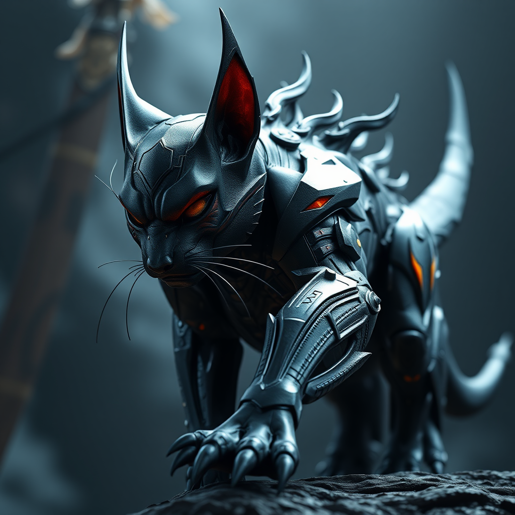 A hyper-detailed, cinematic animation of a sleek, agile creature inspired by a fusion of Batman and a feline, featuring intricate textures and designs, with stunning 8k resolution showcasing dramatic lighting and dynamic motion.