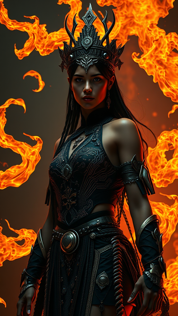 A hyper-detailed cinematic portrayal of a dark fantasy world, featuring a young and stunningly beautiful Queen of Fire standing majestically amidst swirling tongues of flame. Her attire is intricately designed, melding elements of tribal elegance and futuristic circuit board motifs, exuding an aura of power and grace. The composition is impeccable, capturing her in a poised and elegant stance that radiates authority. Her face, flawlessly sculpted, reflects both strength and allure. The scene is enveloped in dramatic lighting and shadows, enhancing the intense atmosphere. This 8k resolution illustration presents an ultra-detailed, photorealistic concept art rendered in high-definition with 3D octane technology, achieving a sharp, focused image ideal for wallpaper. The fantasy is enriched with an aura of trial and mystery, with every element harmonized into a striking visual narrative.