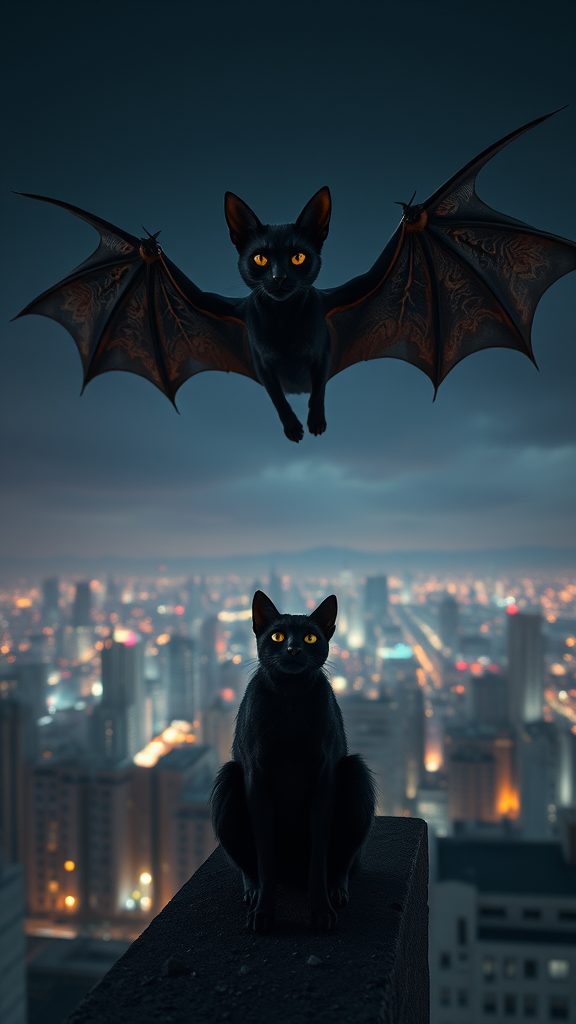 A hyper-detailed, cinematic scene of a bat-cat hybrid, animated in stunning 8k resolution; the creature features sleek, glossy fur with intricate patterns reminiscent of a bat's wings, piercing eyes glowing in the dim light, and poised on a rooftop overlooking a vibrant, bustling city below, its silhouette casting a mysterious, enigmatic shadow against the night sky.