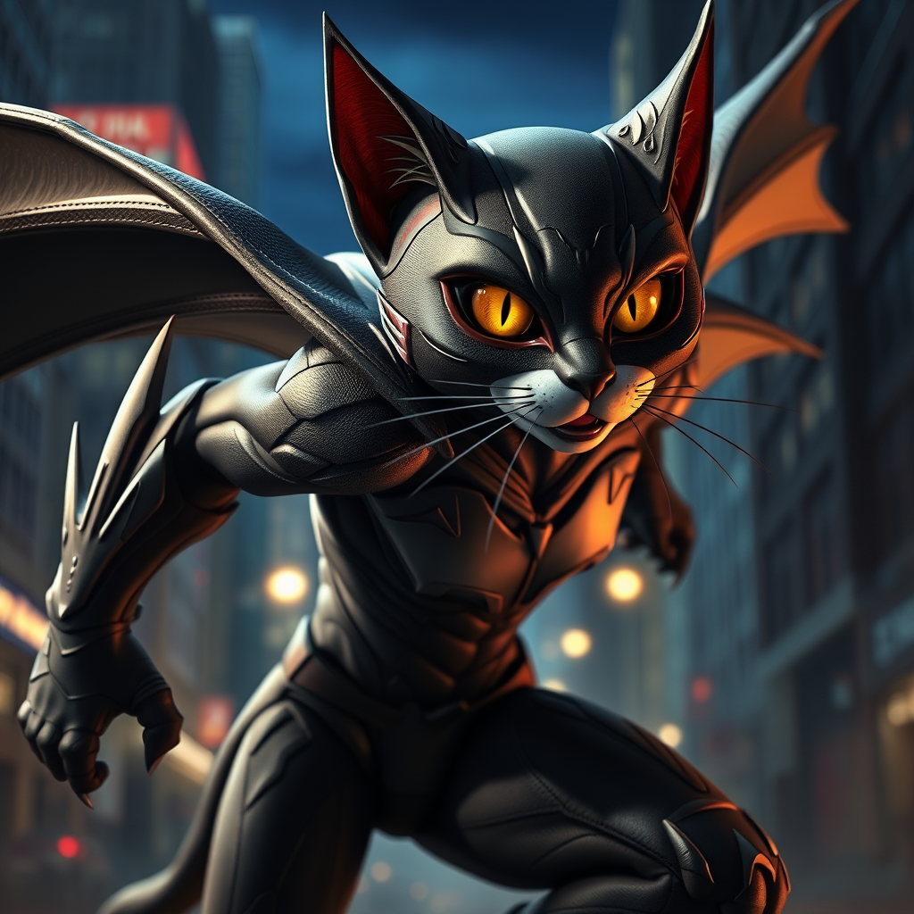 A hyper-detailed depiction of a sleek, feline-inspired superhero blending elements of a bat and a cat, set in a cinematic and animated style, capturing intricate textures and dynamic lighting in stunning 8k resolution, showcasing agility and mystery in a nighttime urban setting.