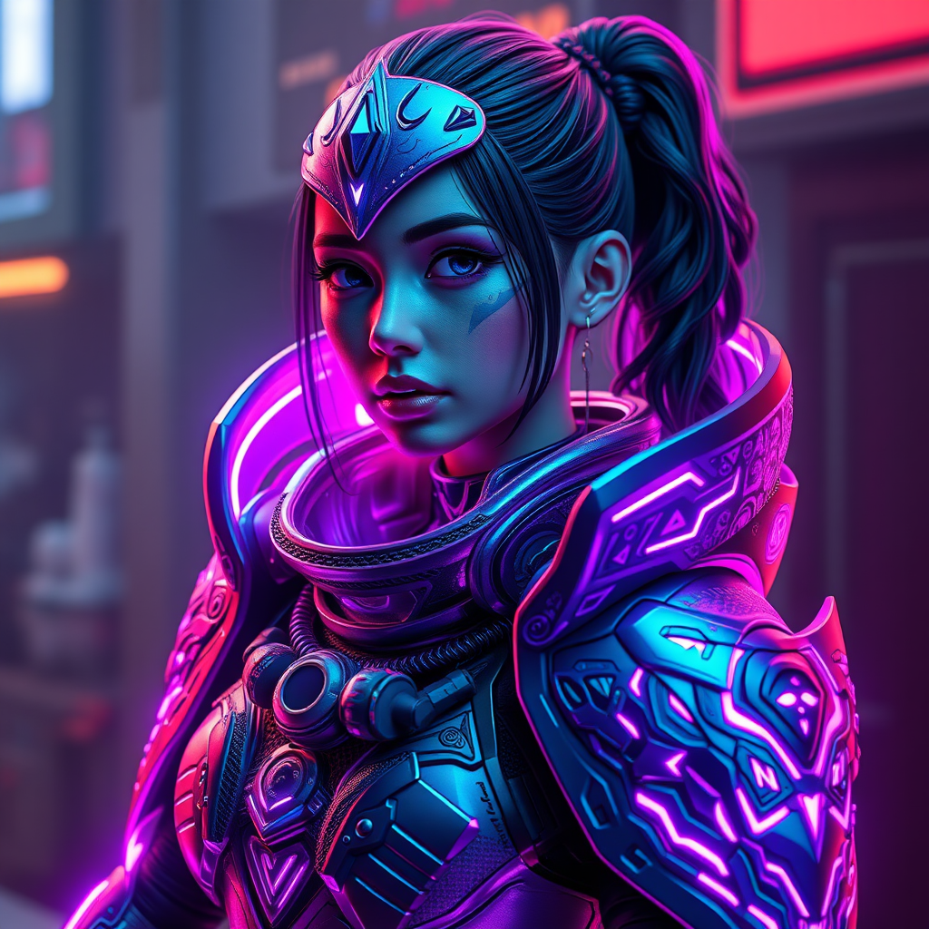 A hyper-detailed depiction of a stunning cyberpunk girl in 8k ultra realism, showcasing full-body intricate armor in vibrant shades of purple and blue neon. Her attire features ornate designs, accentuated by cinematic lighting that highlights the vivid colors and details, creating a mesmerizing visual effect. The scene is focused and high resolution, capturing every element in exquisite detail, reminiscent of trending artworks on ArtStation. The environment is enhanced by the capabilities of Unreal Engine 5, providing a hyperrealistic and cinematic aura, with slight enhancements to the armor's design for a unique twist, set against a 9:16 aspect ratio.
