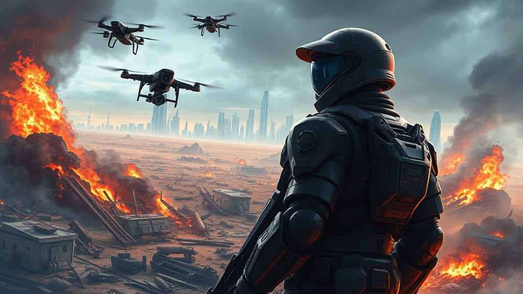 A hyper-detailed digital painting of a sci-fi futuristic soldier in advanced armor, featuring high-tech weaponry and a sleek visor, poised against a war-ravaged battlefield. Hovering drones fill the sky, surrounded by burning wreckage, while a distant, gleaming futuristic city skyline looms on the horizon. The scene is captured in UHD with dynamic lighting, emphasizing the grit and drama of the environment.