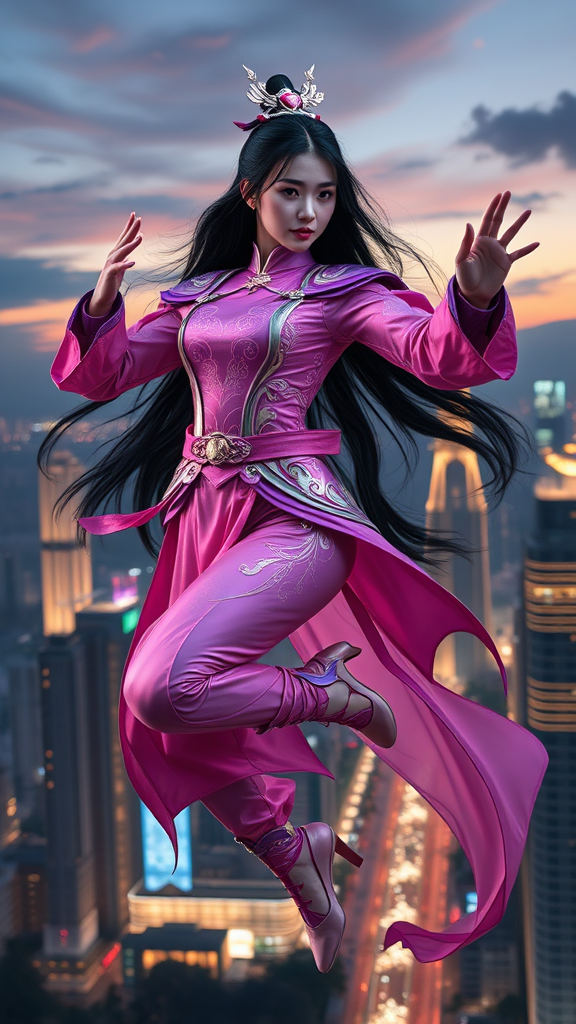 A hyper-detailed full-body image of a Chinese female superhero emerges, poised with grace and power, adorned in an elaborate pink and purple costume. Her attire is a blend of sleek modern design and traditional Chinese motifs, meticulously crafted with delicate embroidery and shimmering textures, reminiscent of silk and celestial armor. Her long, flowing hair cascades like a dark waterfall, contrasting with the luminous tones of her outfit. The composition captures her in mid-leap, against a backdrop of a vibrant metropolis illuminated under a twilight sky. The lighting is an exquisite interplay of soft natural and cinematic volumetric light, casting dramatic shadows that enhance the chiaroscuro effect, akin to a masterful oil painting. This vision channels the spirit of art legends like Raphael and Caravaggio, intersected with modern masters like Greg Rutkowski and Beeple, fusing classical artistry with futuristic elements. The scene is rendered in stunning 8K resolution, with texture and detail so rich it evokes an award-winning photograph, a masterpiece that dances on the edge of reality and imagination.