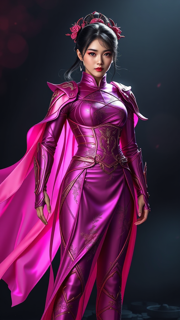A hyper-detailed full-body image of a female Chinese superhero stands poised against a dramatic backdrop, her dynamic pink and purple outfit shimmering with iridescent hues. The outfit is a blend of traditional Chinese elements with futuristic armor, intricately detailed with floral motifs and abstract designs, reflecting elegance and strength. Her cape flows like liquid satin in the soft natural volumetric light, capturing the essence of movement. The composition is impeccably balanced, evoking the chiaroscuro style, with shadows adding a sense of depth and mystique. Her eyes gleam with determination, detailed to the point where you can see the reflection of her vibrant world within. Inspired by classical masters like Raphael and Caravaggio, yet infused with modern digital artistry akin to Beeple and Giger, the rendering is an 8k marvel trending on artstation, akin to an award-winning photograph, a masterpiece merging the soul of oil on canvas with cutting-edge concept art.