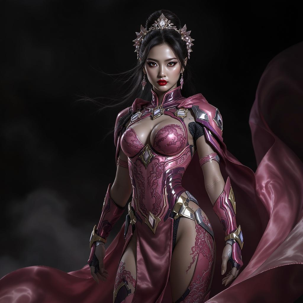 A hyper-detailed full-body image of a female Chinese superhero emerges, clad in an intricately designed pink and purple outfit that blends traditional Chinese motifs with futuristic elements. Her flowing silk cape billows in a subtle breeze, accentuating the elegant movement captured in this masterpiece. The scene is rendered with perfect composition, employing chiaroscuro techniques reminiscent of Caravaggio, while the dynamic pose channels the grandeur of Raphael's figures. The photorealistic concept incorporates Beeple's avant-garde style, with small augmentations of technological enhancements subtly integrated into her attire. The soft, natural volumetric light casts a dramatic yet gentle glow, encapsulating the subject with cinematic allure, drawing parallels to the atmospheric artistry of Beksinski and the surreal imagination of Giger. Each detail of her armor and attire is captured in 8K resolution, echoed in an award-winning oil on canvas vibe, while her determined gaze reflects an unyielding spirit. The composition is a masterpiece resonating with the artistic ethos trending on platforms like ArtStation, where the fusion of classical and contemporary art achievements culminates in a visionary depiction of strength and beauty.
