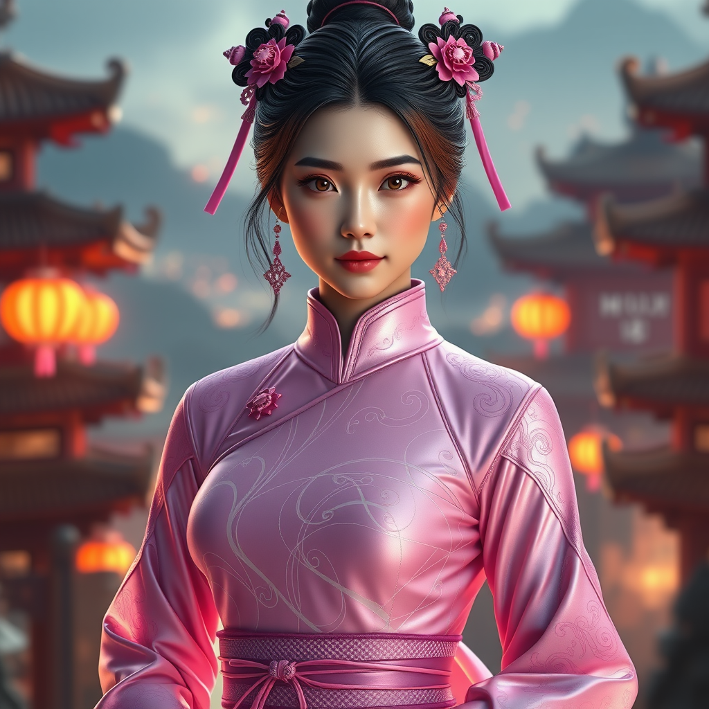 A hyper-detailed full-body image of an elegant female Chinese superhero, adorned in an exquisite pink and lavender outfit. The composition is perfect, capturing the essence of beautiful intricacy with an insanely detailed octane render as seen on ArtStation. The scene is portrayed with 8k artistic photography, merging photorealistic concept art with soft natural volumetric cinematic lighting. Utilizing chiaroscuro techniques, akin to an award-winning photograph, the masterpiece mimics the classic oil on canvas style of Raphael and Caravaggio. Elements of futuristic vision inspired by the dynamic essence of Greg Rutkowski, Beeple, Beksinski, and Giger bring the character to life, enveloped in an ethereal glow that suggests both strength and grace. She stands against a background that hints at ancient Chinese landscapes fused with a modern metropolis, a symbol of bridging tradition and innovation.