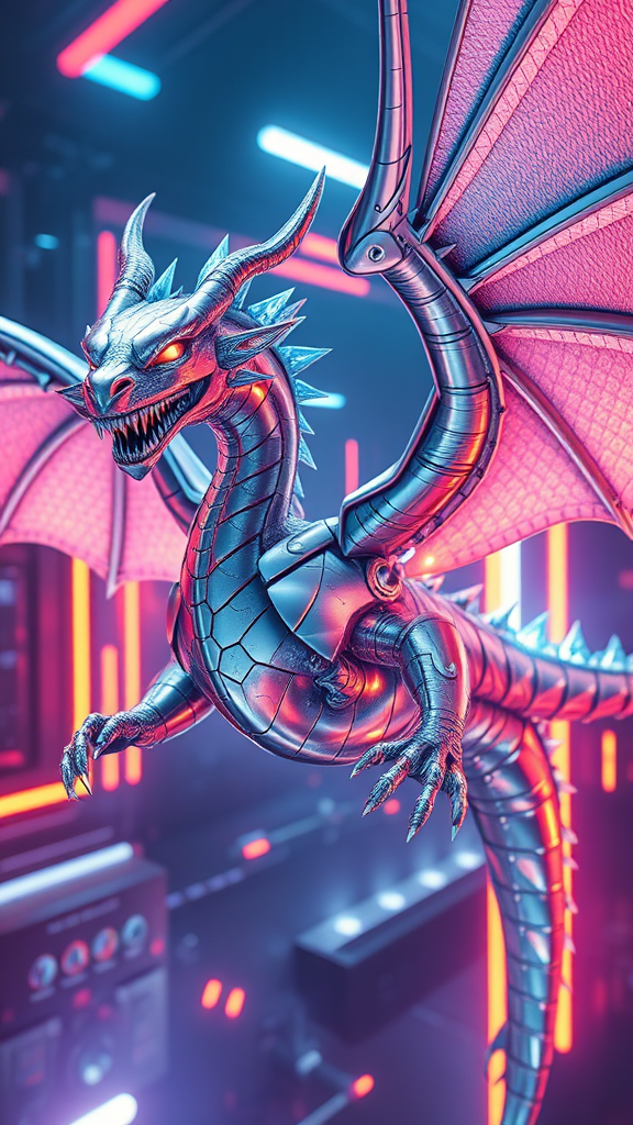 A hyper-detailed, futuristic metal dragon with icy and metallic wings soars through a sci-fi environment, its full body illuminated by neon lights and glowing laser accents. The dragon's fury-filled eyes, sharp and intense, reflect a blend of advanced technology and primal power. Its scales shimmer with a realistic texture, casting reflections like silver mirrors. The environment around it pulses with vibrant, dynamic energy, enhancing the sense of a high-definition, 4K ultra-resolution scene. As it moves, the dragon effortlessly balances elements of sleek modern design and ancient myth, exuding an air of both elegance and domination in an otherworldly realm where sci-fi integrates seamlessly with fantasy, composed in a striking vertical composition.