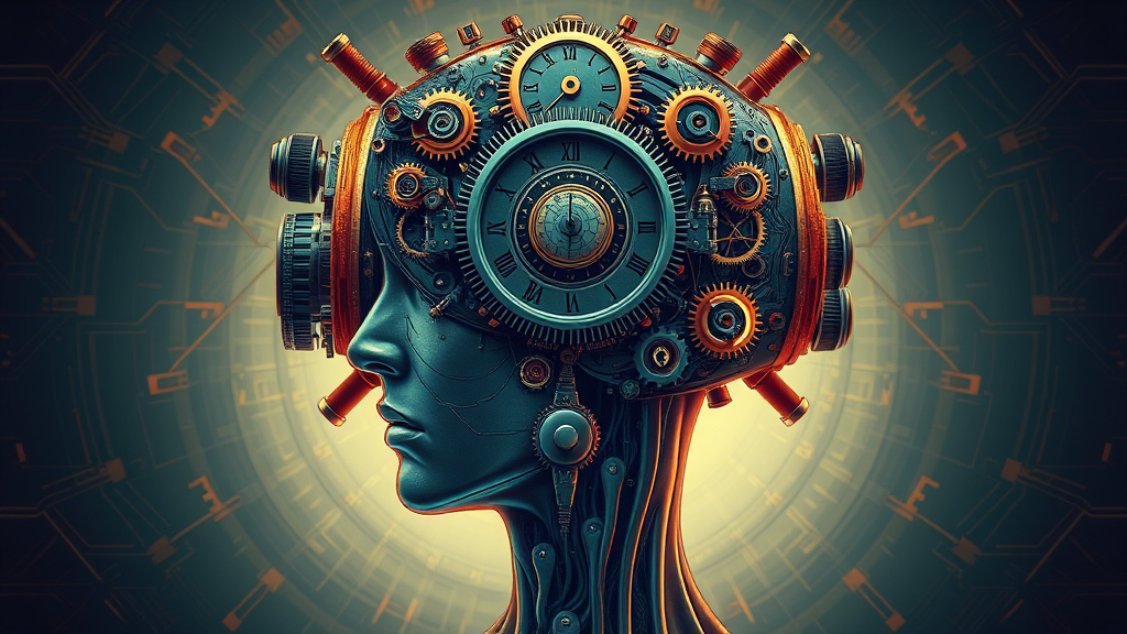 A hyper-detailed illustration of a human head crowned with an intricate clockwork mechanism, designed in a futuristic style with mechanized precision; colors of cyan and amber interplay across the complex gears and circuits. The composition is symmetrical, boasting a realistic rendering with lowbrow art influences. Elements of daz3d modeling are evident, showcasing intricate textures and reflections. The concept blends the organic curves of the human form with the angular edges of technology, creating a harmonious balance between nature and machinery. The artistic vision captures a sense of time and intelligence fused together, with a raw style that emphasizes the juxtaposition of life and automation.