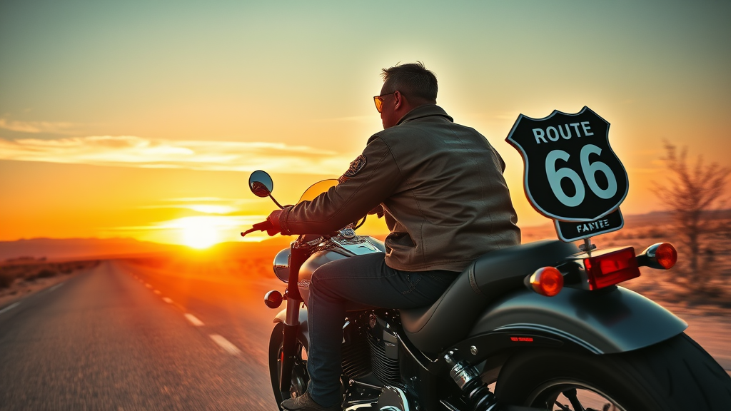 A hyper-detailed image of a biker riding a classic Harley Davidson motorcycle along Route 66 at sunset, captured from a side view. The scene is infused with vibrant colors as the sun dips below the horizon, casting a warm glow over the open road. The biker, donning a worn leather jacket and aviator sunglasses, embodies the spirit of freedom and adventure. The landscape features distant mountains and stretches of desert, enhancing the sense of journey and exploration. Dust trails subtly rise behind the motorcycle, adding to the dynamic feel of this iconic moment.