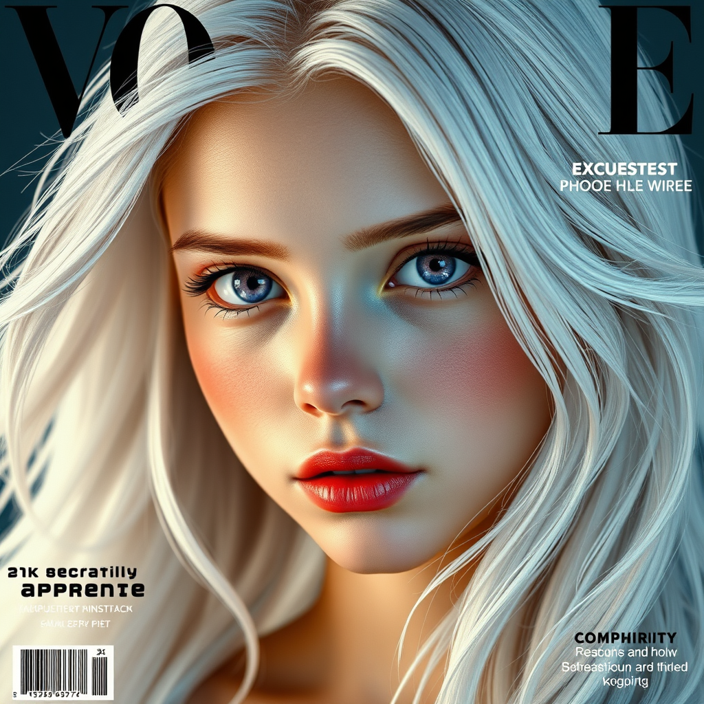 A hyper-detailed magazine cover showcasing a strikingly realistic and alluring girl with an enchanting face, flowing white hair, and captivating purple eyes. The image bursts with vivid colors, rendered in 8k UHD and HDR quality for maximum visual impact. While emphasizing beauty, the depiction does not shy away from subtle skin imperfections like spots and blemishes, adding authenticity and depth to the character. She conveys a sense of youthful allure with a gentle, innocent demeanor. The artistry avoids anatomical discrepancies, ensuring a proportionate and realistic figure. The absence of logos or text keeps the focus solely on the visual elegance of the subject, creating a captivating and immersive viewing experience.