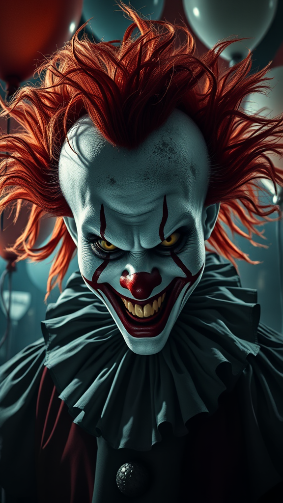 A hyper-detailed masterpiece photograph portrays a sinister clown with an unearthly malevolence emanating from its eyes, twisted into a wicked smile. The clown's face is painted in stark white with crimson accents dripping like blood, contrasting with a tangled mane of wild, blazing red hair. Shadows cast unsettling shapes across its face, accentuating its otherworldly presence. The background is a dimly lit carnival, distorted and warped as if seen through a feverish nightmare, amplifying the unsettling atmosphere. Balloons, decayed and deflated, hang lifelessly around the scene, while the clown's gaze seems to pierce through the soul, leaving an indelible mark of terror.