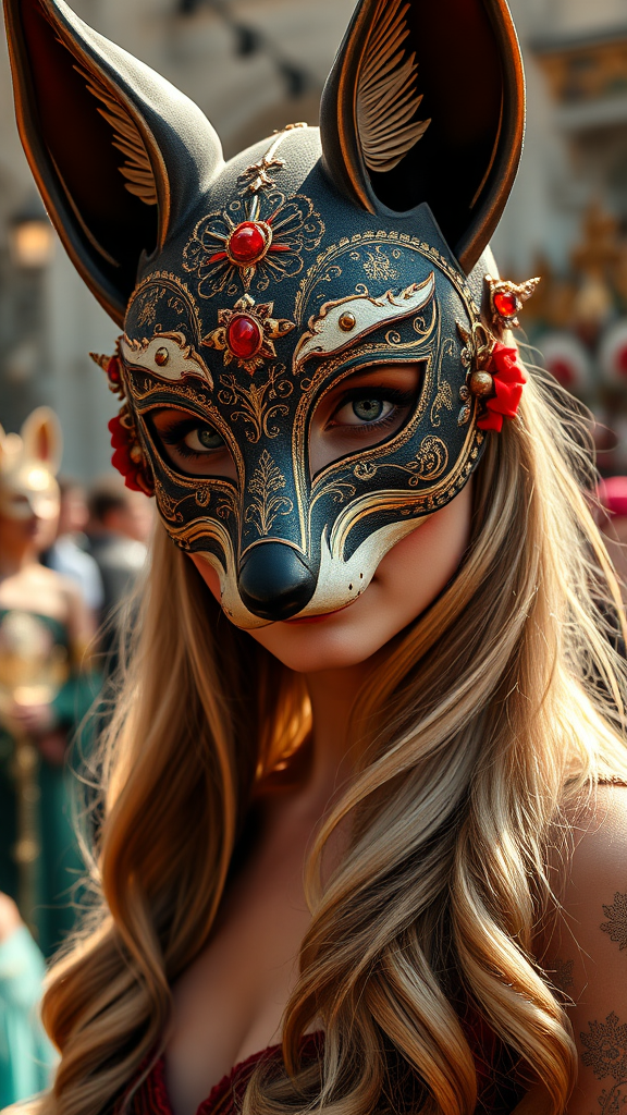 A hyper-detailed, photo-realistic 4k portrait of a woman at the Venetian carnival, wearing an intricately designed fox mask adorned with delicate gold filigree and vibrant red accents. Her piercing blue eyes peer through the mask, surrounded by elegantly painted face details. She has long, flowing blond hair cascading in soft waves over her shoulders, shimmering with a golden sheen under the warm sunlight. The setting is alive with the lively atmosphere of the carnival, characterized by a blur of colorful costumes and ornate masks in the background. The style reflects an oil painting, with rich textures and deep, lush colors adding to the depth and realism of the image, capturing the essence of mystery and elegance associated with the Venetian carnival.