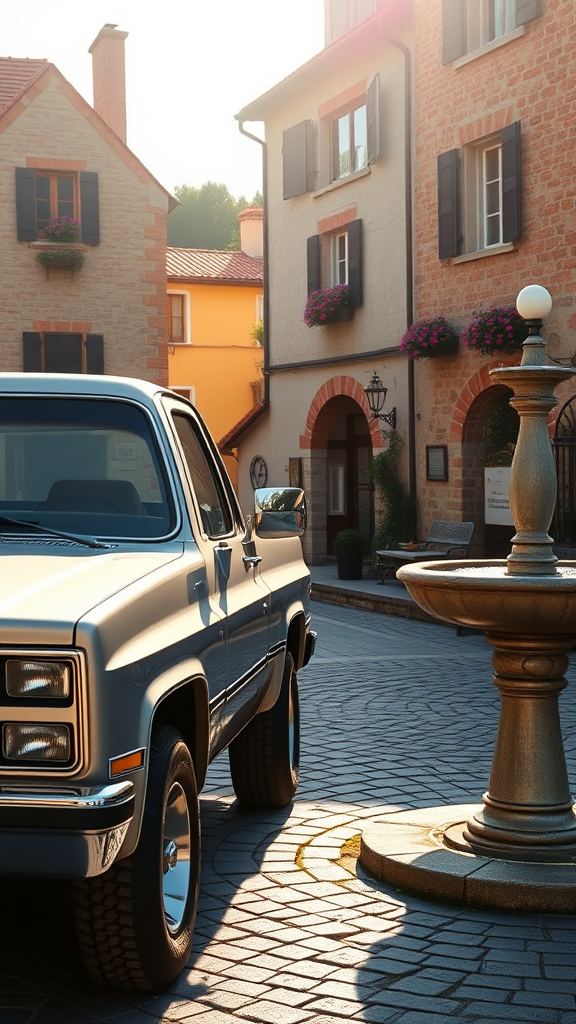 A hyper-detailed, photorealistic image of a polished Silver Chevrolet Blazer K5 from 1987 parked in a quaint village square at midday. The sun casts a bright glow, highlighting the truck's classic lines and chrome accents. Nearby, an old stone fountain trickles gently, and charming cottages with flower-filled window boxes line the cobblestone street. The vibrant colors and textures evoke a cinematic atmosphere, capturing the essence of a tranquil village life. High-resolution 8K captures every detail with stunning clarity and realism.
