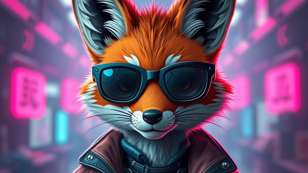 A hyper-detailed portrait of a cartoon fox sporting sleek sunglasses, blending the aesthetics of vray tracing with neonpunk elements, crafted using photorealistic techniques reminiscent of a Konica Big Mini camera. The fox is adorned in intricately designed costumes, set against a backdrop that exudes a cold and detached atmosphere. Captured in 8k resolution, the image features razor-sharp focus, emphasizing ultra-high detail, presenting an intriguing juxtaposition of classic charm and futuristic style in a 2:3 aspect ratio.
