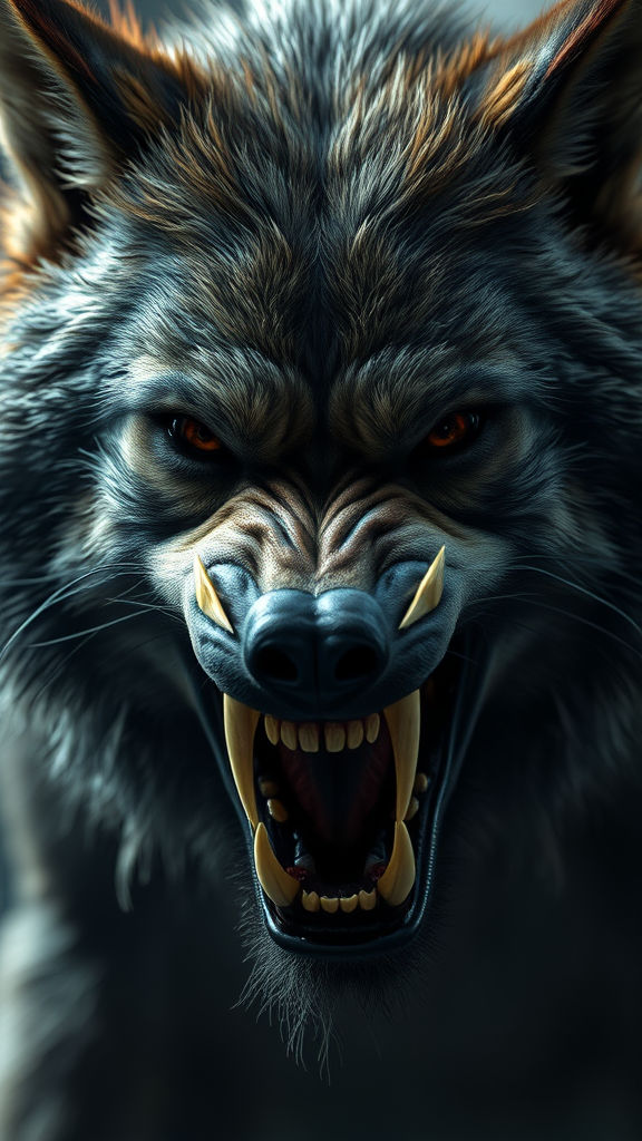 A hyper-detailed portrait of a menacing werewolf showcasing its ferocious fangs and piercing, eerie eyes. The creature's long, sinewy fur is accentuated by cinematic and volumetric lighting, creating an epic and impeccably composed scene. The photorealistic rendering captures every intricate detail with a subtle bokeh blur, artistic character design, and cutting-edge technology reminiscent of Unreal Engine and Octane render. Utilizing HDR and subsurface scattering techniques, the image takes full advantage of the Hasselblad H4D 200MS Digital Camera paired with a Mitakon Speedmaster 65mm f/1.4 XCD lens. The scene is further enhanced by sophisticated Fresnel lighting, adding an atmospheric depth that complements the terrifying beauty of this mythical creature.