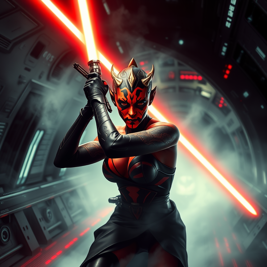 A hyper-detailed portrait of a stunning and menacing Zabrak woman, inspired by Darth Maul, gracefully wielding a Sith lightsaber as she charges down the deck of a spaceship. Her intense expression reflects epic emotions and dynamic movement, surrounded by swirling galaxy fog. The composition is perfect and aesthetically captivating, featuring a seductive pose in hyper-realism, enhanced with 5D dimension effects. The scene is powered by unreal engine and a 3D octane rendering, creating a dark fantasy ambiance reminiscent of Zack Snyder's visionary style, capturing the essence of the galaxy in breathtaking CGI.