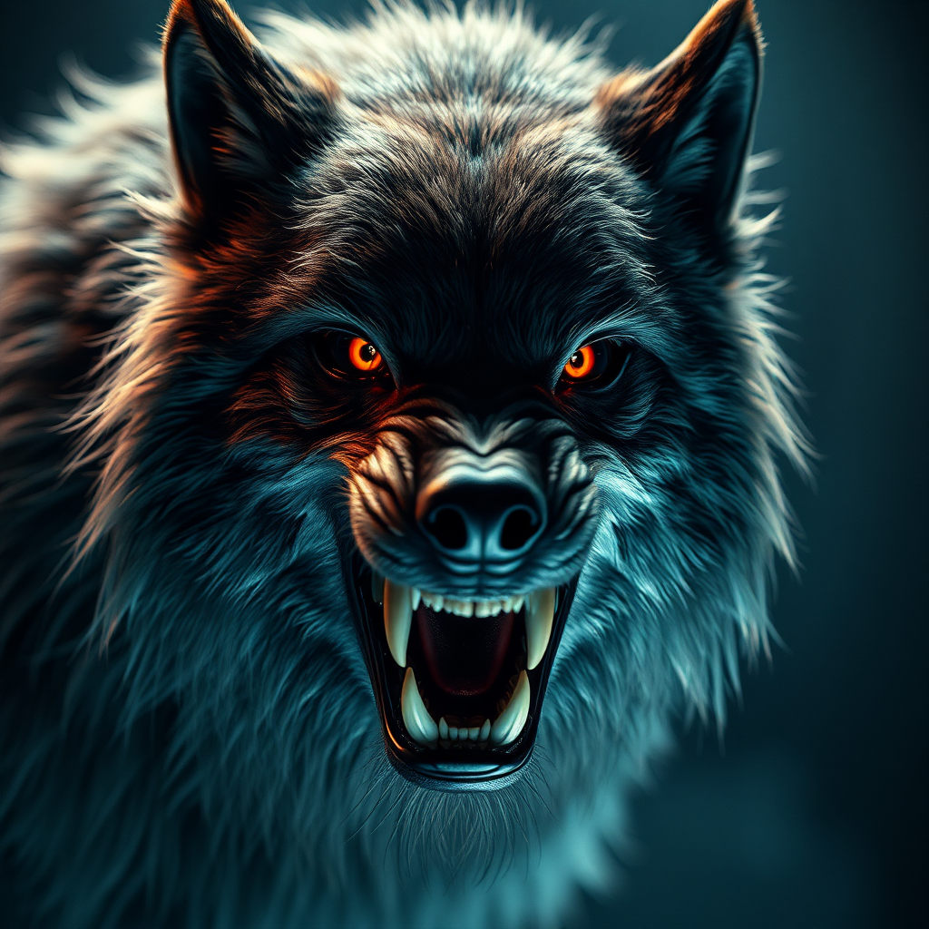 A hyper detailed portrait of a terrifying werewolf featuring fearsome fangs and unsettling, vivid eyes. The werewolf's long fur is illuminated by cinematic and volumetric lighting, creating an epic and perfectly composed scene. Achieving photorealism with a soft bokeh blur, the creature stands out in its hyper-detailed character design. Rendered with a sense of realism akin to Unreal Engine and Octane render, it showcases HDR effects and subtle subsurface scattering. Crafted to mimic a shot from a Hasselblad H4D 200MS Digital Camera using a Mitakon Speedmaster 65mm f/1.4 XCD lens, the image benefits from the dramatic touch of Fresnel lighting, highlighting the werewolf's menacing presence.