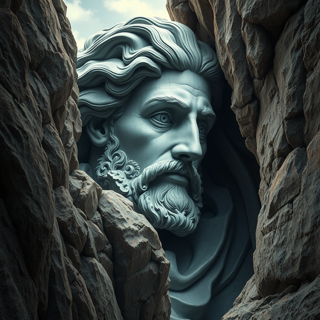 A hyper-detailed, realistic portrait of a majestic art statue embedded in rugged cliffs, capturing intricate facial features and set against a dynamic landscape reminiscent of cryengine visuals. Inspired by the sophisticated style of Ingrid Baars and the multi-panel compositions of Guido van Helten, this concept art piece emphasizes fine textures and striking contrasts. The imagery conveys a sense of grandeur, with the statue's expressive visage overlooking the cliffside, artfully integrating natural and sculptural elements.