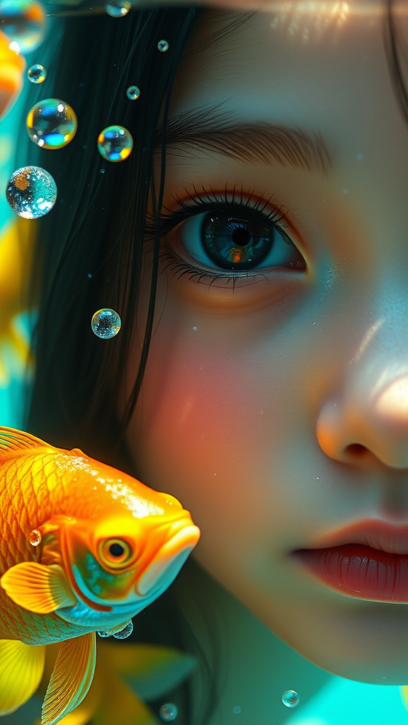 A hyper-detailed realistic render featuring a dreamy close-up of a cute girl and vividly colored fish, with half of her face submerged in water. Her expressive eyes, captured with an exaggerated perspective, reveal a sense of wonder. Inspired by Makoto Shinkai and Otomo Katsuhiro, the scene is infused with a glowing palette of yellows and blues, highlighted by a shimmering play of light. Water droplets on her face resemble pearls with iridescent hues, as the holographic whites and greens contrast against a soothing aquatic background. The Tyndall effect is evident, creating a magical ambiance around the girl, with brush-like strokes mimicking the texture of hyper-realistic oil painting.