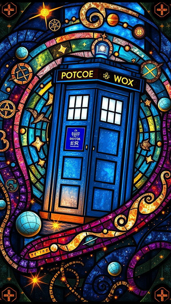 A hyper-detailed stained glass artwork depicting the Tardis amid swirling Gallifreyan symbols, intricately designed with vibrant colors and sparkling reflections that catch the light, capturing the magical essence of Doctor Who's universe. The Tardis stands tall against a cosmic backdrop, its iconic blue hue interwoven with glittering patterns, casting mesmerizing shadows. Small planets and stars encircle the scene, adding depth and wonder to the celestial design. The overall composition is rich in texture and detail, inviting viewers to explore the mysteries of time and space.